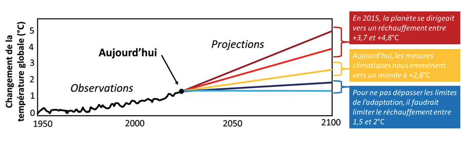 En 2015, durant la COP 21, 195 pays signaient le premier traité international de réduction des émissions de gaz à effet de serre : le fameux Accord de Paris. Les États s’engageaient alors à comptabiliser et à faire diminuer leurs émissions de gaz à effet de serre pour limiter le réchauffement de la planète en dessous de 2°C. Cet accord était un grand pas, car avant 2015, les modèles climatiques prévoyaient une augmentation de la température globale entre 3,7 et 4,8°C d’ici à la fin du siècle (voir graphique), ce qui allait rendre notre planète en partie inhabitable.