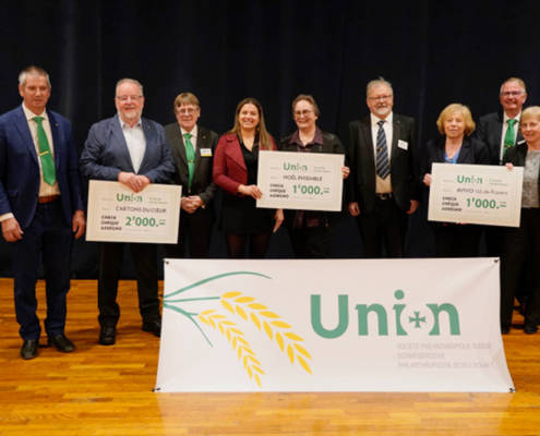 De gauche à droite : Francis Monnier, représentant du comité central de la société philanthropique suisse Union, Pascal Boillat, représentant des Cartons du cœur, Pierre-Alain Schwarb, président des fonds de bienfaisance de la société philanthropique Suisse Union, Christelle Isler et Sylvie Sanjuan, représentantes de Noël Ensemble, Jämes Vaucher, président de la commission philanthropique du cercle du Val-de-Travers de la société philanthropique suisse Union, Gloria Barbezat et Anne-Marie Jaegger, représentantes de l’Avivo. En arrière-plan, Michel Blanc, président du cercle du Val-de-Travers de la société philanthropique suisse Union.