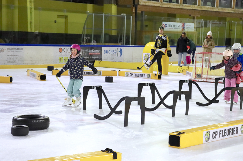 « Honnêtement oui ! On voit que la population s’est familiarisée avec le concept. Aujourd’hui, on a des personnes de 15 à 50 ans qui sont venues s’initier gratuitement. Et il n’y a pas que des gens du Vallon », précise Thierry. Autre bonne nouvelle, les sociétés jouent le jeu puisque leur nombre a doublé entre la première et la seconde édition. Il y en avait 4 entre décembre 2024 et mars 2025 et il y en a 9 cette année. Les dirigeants du CP Fleurier, Sven Renaud et David Racheter, ne cachent pas leur plaisir d’en faire partie : « On est venus voir si la relève du hockey vallonnier s’est déplacée aujourd’hui (ndlr : dimanche dernier). Et aussi parler un peu du club pour étoffer le public aux matches de la première équipe », lâchaient-ils avec un sourire taquin aux lèvres. La relève était bien présente, parfois même avec le maillot jaune et noir déjà sur les épaules. À leurs côtés, des joueurs de la première équipe s’étaient justement déplacés pour les encadrer.