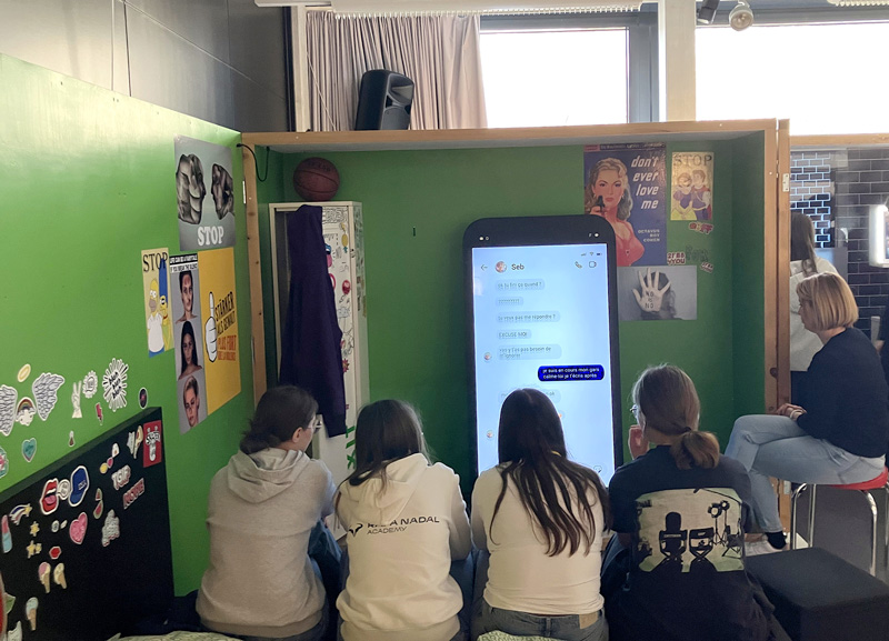 La pièce probablement la plus intéressante est celle de l’adolescente. Assis sur le lit, les élèves, manettes « stop » en main, doivent interrompre, au moment qu’ils jugent problématique, une conversation sentimentale via des messages entre une ado et un garçon qui va déraper. Là, l’attitude de chacun et chacune diffère. Les filles appuyant plus promptement que les garçons. « Par rapport à l’envoi de photos, vous faites comment ? », demande Jessica Hurtlin. La réponse des élèves est claire : pas de « cliché gênant ». La policière leur recommande de « réfléchir deux secondes » avant d’envoyer quelque chose. Surtout, elle conseille de s’assurer du consentement de l’autre afin d’éviter toute situation litigieuse. Les deux intervenantes en conviennent, la chambre d’ado est celle qui produit le plus de réactions et réflexions. « Cela fait référence à leur réalité », expliquent-elles. Toutefois, Gabriela Py remarque qu’un des endroits qui marquent le plus les élèves est « l’entrée », là où sont exposés des chiffres liés à la violence domestique.