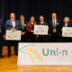De gauche à droite : Francis Monnier, représentant du comité central de la société philanthropique suisse Union, Pascal Boillat, représentant des Cartons du cœur, Pierre-Alain Schwarb, président des fonds de bienfaisance de la société philanthropique Suisse Union, Christelle Isler et Sylvie Sanjuan, représentantes de Noël Ensemble, Jämes Vaucher, président de la commission philanthropique du cercle du Val-de-Travers de la société philanthropique suisse Union, Gloria Barbezat et Anne-Marie Jaegger, représentantes de l’Avivo. En arrière-plan, Michel Blanc, président du cercle du Val-de-Travers de la société philanthropique suisse Union.