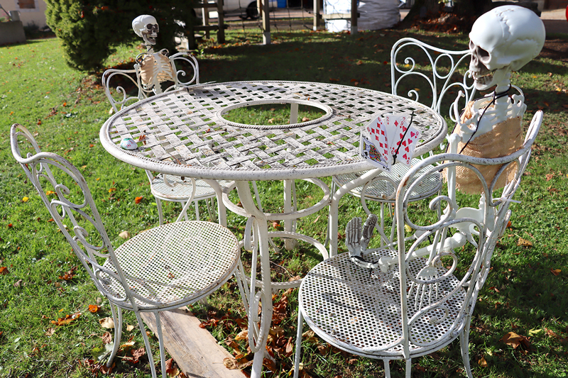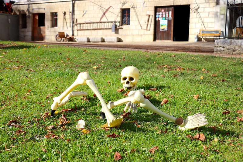 Se balader vers la fin du mois d’octobre dans les villages du Val-de-Travers est toujours source de découvertes que l’on qualifiera d’originales. Crainte pour les uns, amusement sans fin pour les autres, Halloween représente globalement un puits de créativité sans fond pour la population. La preuve avec cette scène découverte aux Verrières. Sur la route de ma promenade, je découvre ce jour-là deux squelettes qui ont fait de vieux os lorsqu’ils étaient en train de jouer aux cartes semble-t-il. En réalité, je dois vous avouer les dessous de cette scène. Ce sont mes deux amis, Joël et Florent. J’étais simple spectateur de leur « bataille » de cartes lorsque Joël s’est tourné vers moi pour me demander mon avis, ne connaissant aucunement ce jeu, il a attendu, attendu et encore attendu que je lui réponde. Coriace, Joël a attendu longtemps et le temps a fini par le rattraper. Par contre, pour le cadavre qui sort de terre à quelques mètres de cette table de jeu, je n’ai aucune explication à donner. Je n’y suis pour rien, promis. Peut-être doit-on cette macabre découverte aux protagonistes du film d’horreur vallonnier Caroline Hills. Mystère ! L’enquête reste ouverte…