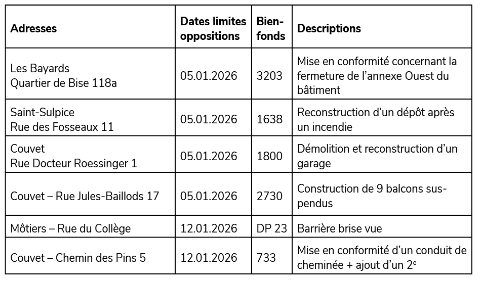 Les demandes doivent être adressées à : Protection de la population, Abbaye de Fleurier, Grand-Rue 38, 2108 Couvet, jusqu’au 31 janvier 2026.