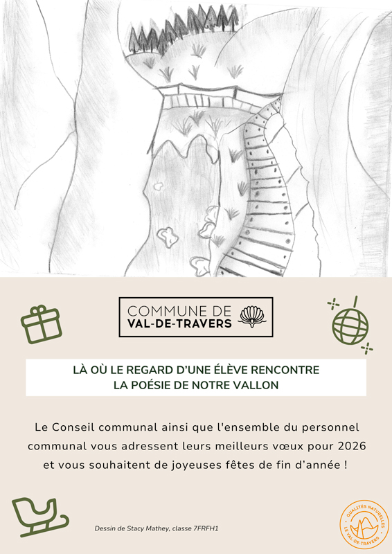 La carte de vœux de la Commune de Val-de-Travers a été réalisée par la classe 7FRFH1 de Grégoire Fatton dans le cadre d’un projet mené avec le Canton. L’objectif était de créer un lien entre l’école et les autorités, tout en proposant aux élèves de travailler autour de leur région et de ce qui la caractérise.