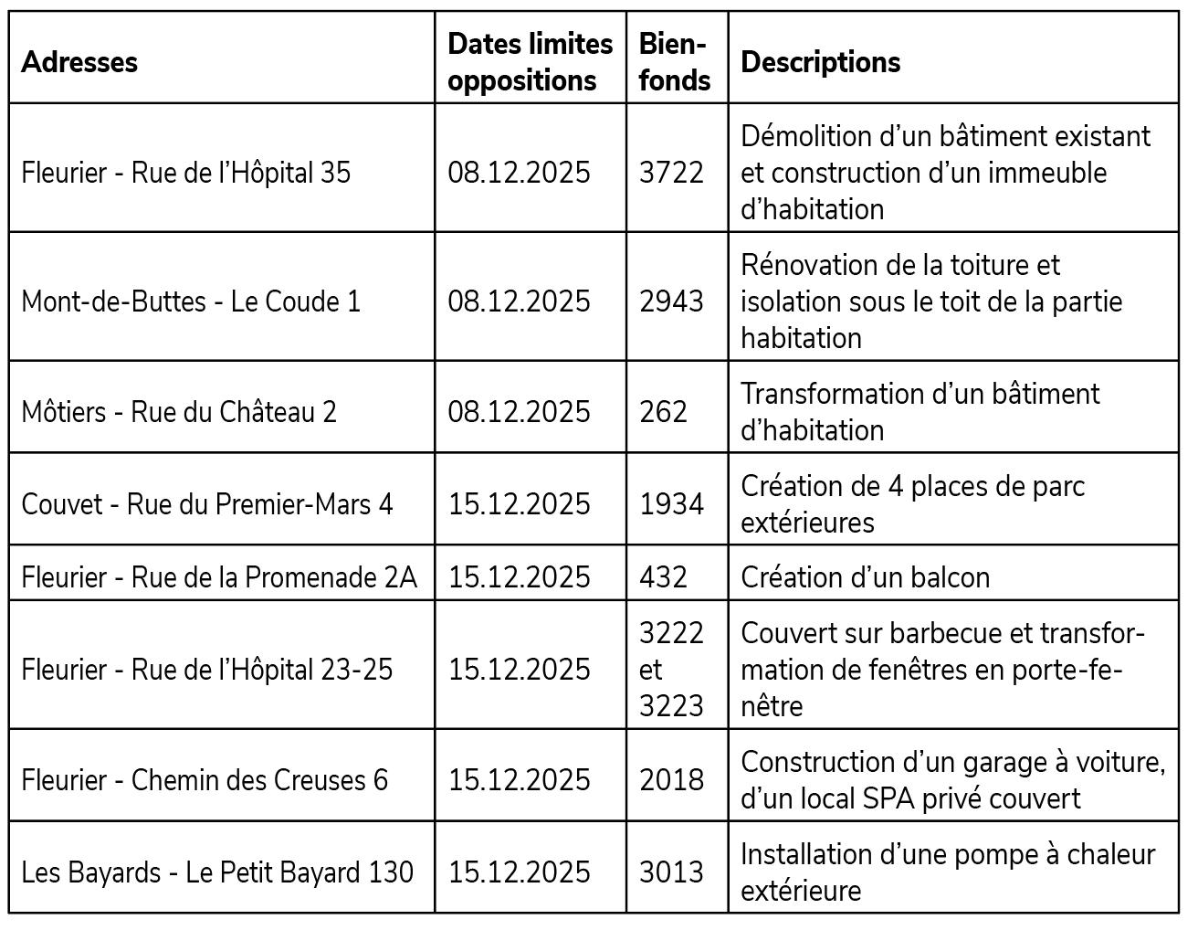 Les nouvelles mises à l’enquête publique sont à consulter au service de l’aménagement du territoire à Couvet.