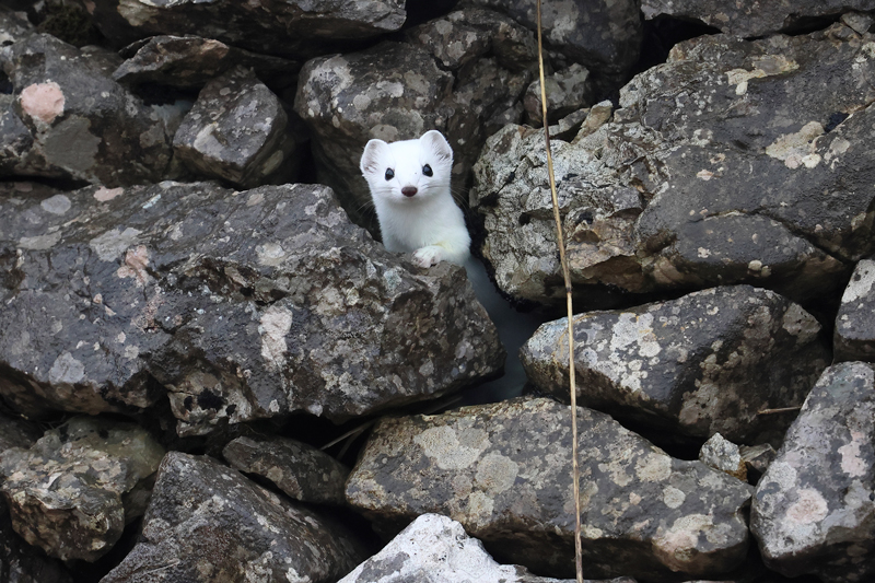 Avec son camouflage blanc, elle a du mal à passer inaperçue parmi les murs de pierre sèche non enneigés. •