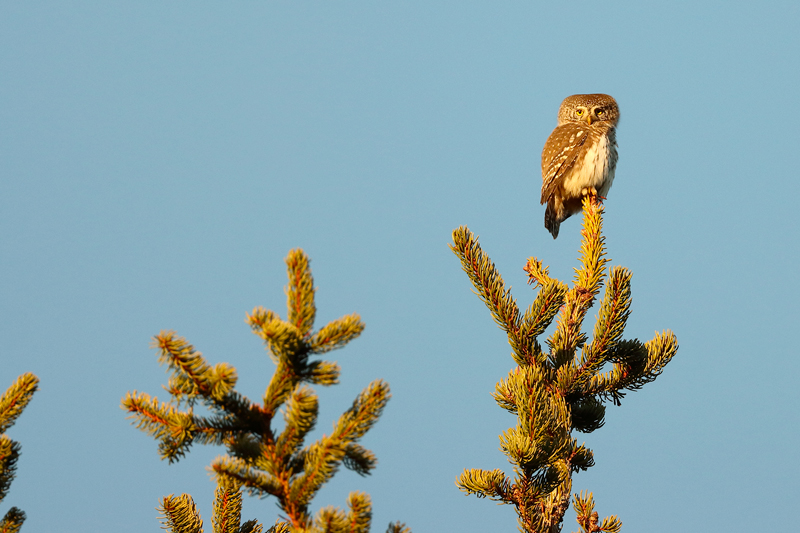 En période de reproduction, les chouettes chevêchettes se perchent au sommet des sapins pour faire entendre leurs chants. •