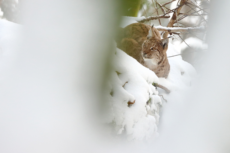 Une femelle lynx surveille son petit qui joue non loin dans la neige. •