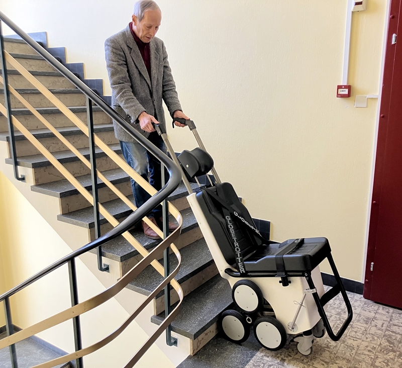 Cette chaise monte-escaliers est l’invention de Jean Reimann et sa conception remonte à la fin des années 1980 et au début des années 1990. L’origine de l’idée, pour l’ingénieur ayant précédemment travaillé au CERN et chez Piaget, remonte lorsqu’il voit des pompiers porter, à travers des escaliers, une personnes handicapée à Genève. « Ils m’ont appris qu’aucune machine n’existait », relate l’inventeur. Alors qu’il travaillait à d’autres projets au sein de sa société Aluweld SA, tel un diable avec assistance, Jean Reimann décide de plancher sur ce siège dans son garage à Genève. « L’enjeu social était plus important », relève-t-il.