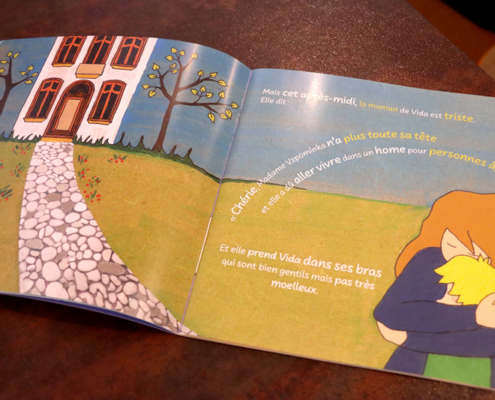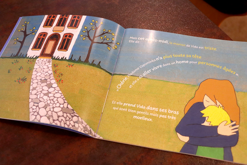 Petit à petit et d’aller-retour en aller-retour, sculptures et peintures ont trouvé place dans l’appartement du couple. Dans cette ambiance cosy, il ne manquait plus qu’une bonne histoire à raconter autour du « poêle à bois ». Et ça tombe bien, Adriana vient justement de sortir le 2e volet de son livre pour enfants « Vida Prumpe » ! « C’est une histoire toute simple – mais pleine de sens – autour des mots, de leur signification et surtout de ce qu’on en fait. Cela parle de générations et de relations aussi. » Si le 1er volet – Le tableau bleu – avait été écrit en français et en allemand, celui-ci – Des mots plein les poches – se contente du français. Comme le précédent, il pourrait servir d’outil pédagogique dans le cadre scolaire.