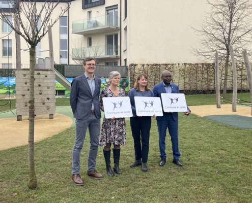 De gauche à droite : Frédéric Mairy, conseiller d’État, Solange Platz Erard, conseillère communale de Milvignes, Sarah Fuchs-Rota, conseillère communale de Val-de-Travers et Hassan Assumani, conseiller communal de La Grande Béroche, lors de la remise du label
