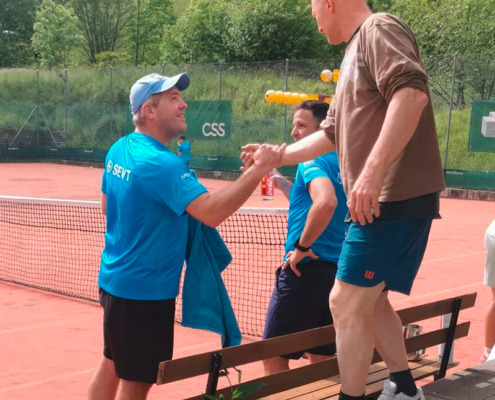 Thierry Schlaeppi félicite Terry Baillods, sous les yeux de David Currit. La première équipe du TC Val-de-Travers est prête pour le tour de promotion en 1re ligue.Des Vallonniers en «mode promotion»